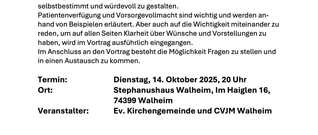 Auf Einladung der Evangelischen Kirchengemeinde und des CVJM Walheim spricht Anita Ereth vom Ambulanten Hospizdienst Neckar-Stromberg e.V. darüber, was wir … WEITERLESEN