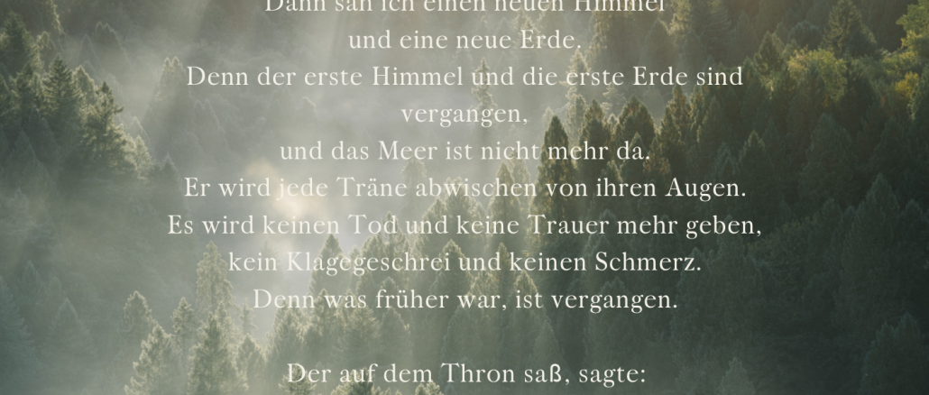 Dann sah ich einen neuen Himmel und eine neue Erde. Denn der erste Himmel und die erste Erde sind vergangen, … WEITERLESEN
