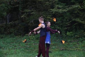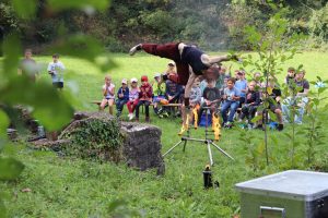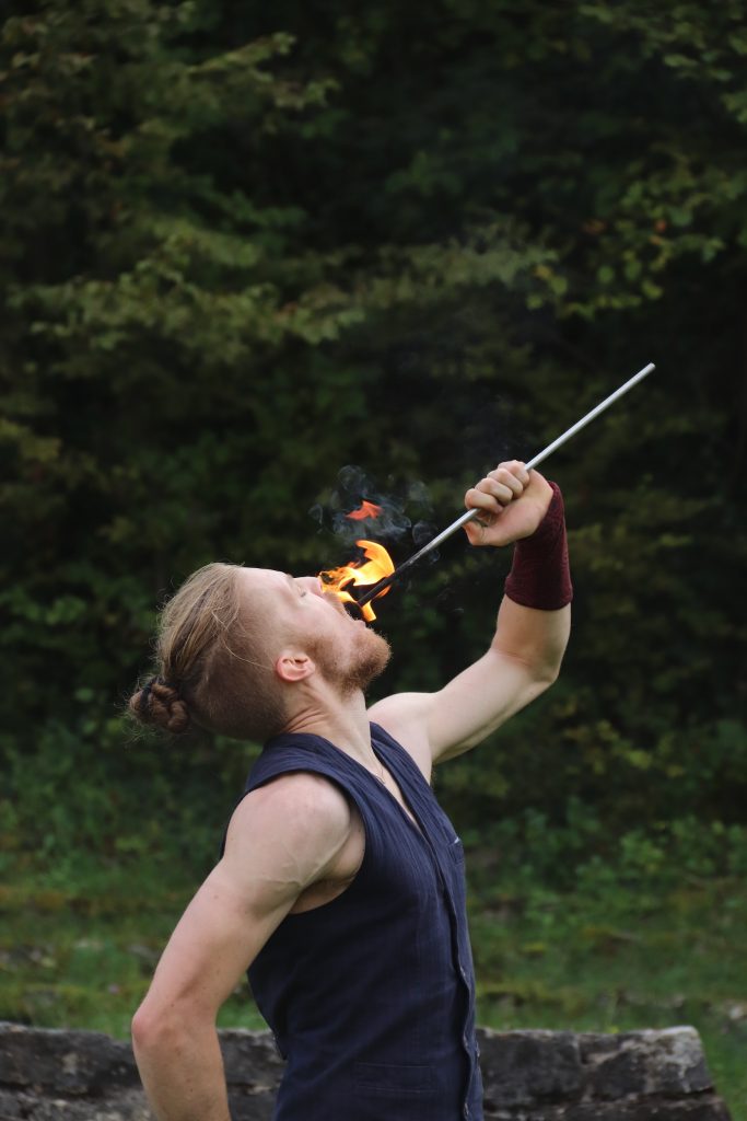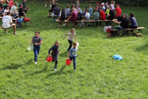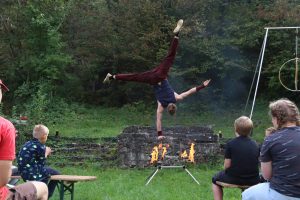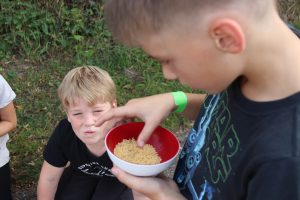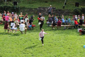 Spannend ging es weiter. Pfarrer Christian Lehmann nahm die Kinder mit in die Geschichte von Elia. Auch hier war das Element Feuer zentraler Bestandteil. Doch zuerst wurde die 3 Jahre andauernde Dürre aus der Bibelgeschichte mit Butterkeksen und einem Pfeif-Wettbewerb veranschaulicht. So mussten die ausgewählten Teilnehmer erst 4 Butterkekse essen und mit der „Dürre“ im Mund dann so schnell wie möglich pfeifen. Gar nicht mal so leicht, wie sich rausstellte. Das sollte aber nicht die einzige Aktion sein. Pfr. Lehmann band die Kinder in die Geschichte mit einband., So wurden die tanzenden Baals-Priester nachgespielt und natürlich musste auch Wasser für Elia geholt werden.