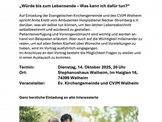 Auf Einladung der Evangelischen Kirchengemeinde und des CVJM Walheim spricht Anita Ereth vom Ambulanten Hospizdienst Neckar-Stromberg e.V. darüber, was wir … WEITERLESEN